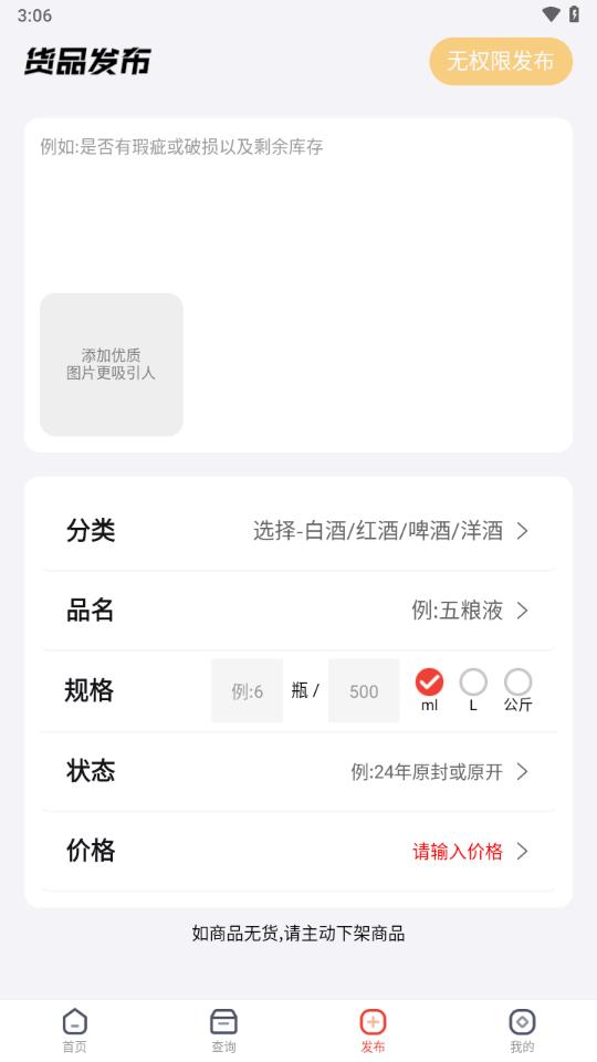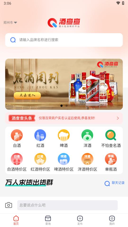 酒查查app下载官方是一款在线求货出货的平台,平台拥有首页,查询,发布,我的等功能板块,可以帮助用户更好的酒水查询,求货出货,觉得不错的朋友欢迎前来下载使用。