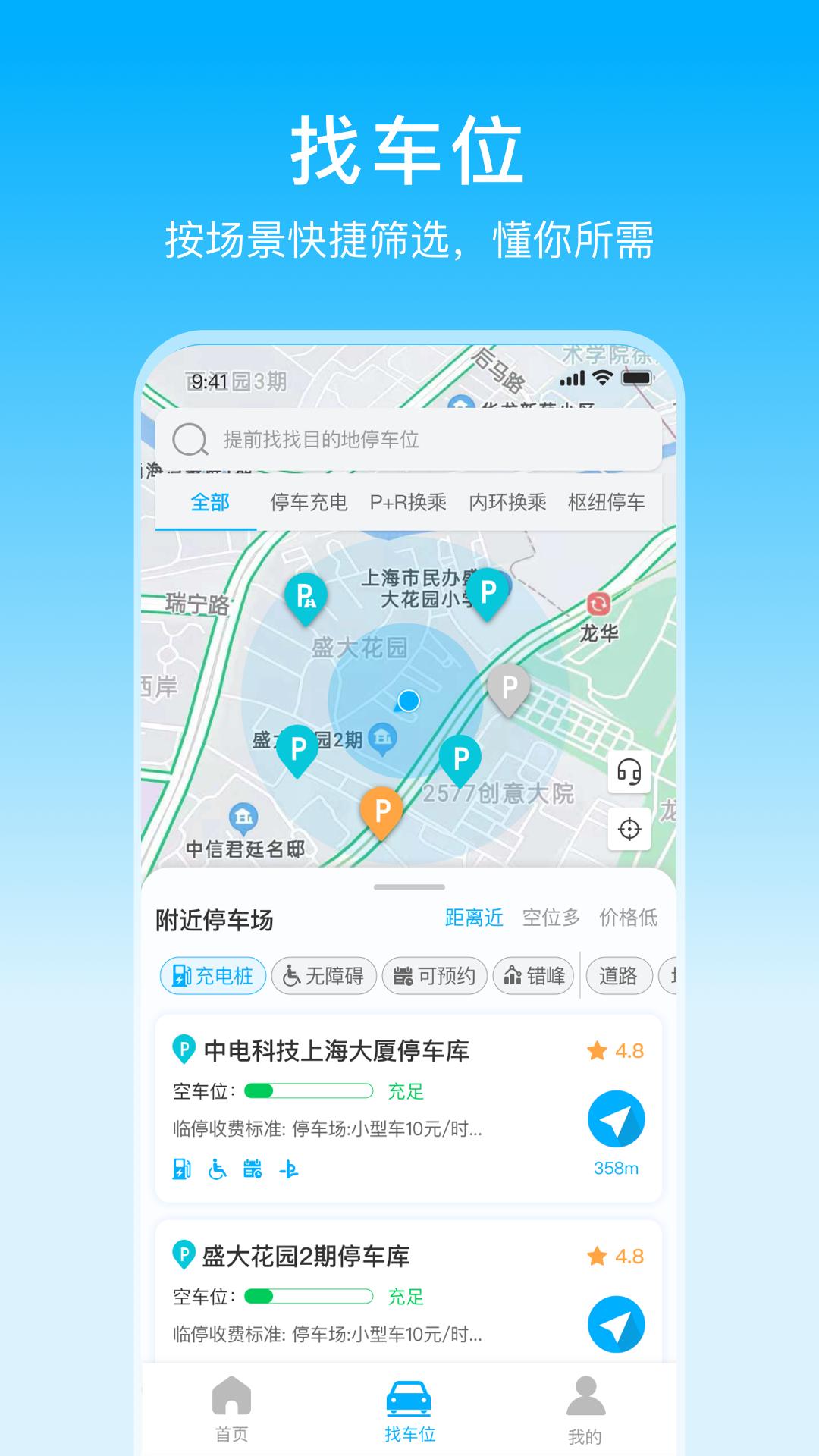 上海停车APP向社会公众提供“驾车导航、停车换乘、错峰共享、停车缴费、停车预约、停车充电、电子票据”等服务功能。用户可以通过“上海停车”一个入口便捷了解目的地车位现状、规划出行、精准导航、预约车位,在线缴费,无感离场等享受更便捷、更智能、更贴心的停车服务。