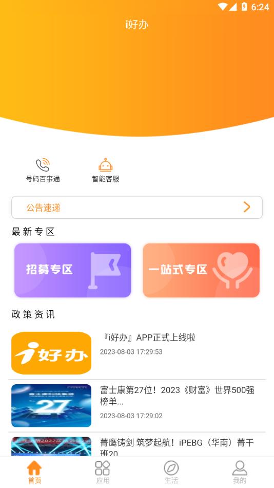 i好办app下载是一款移动办公服务平台,平台拥有首页,应用,生活,我的等功能板块,可以助力员工更智慧便捷工作生活,需要的朋友赶紧来下载使用吧。