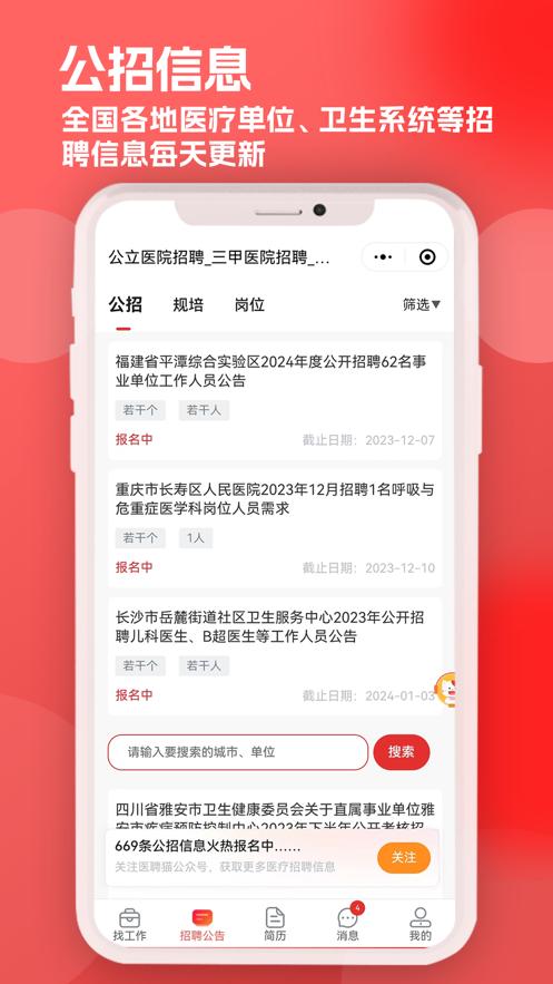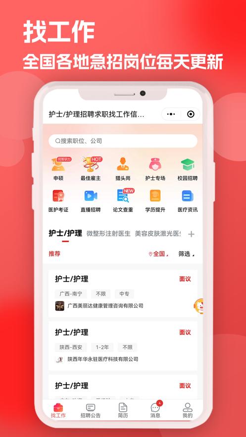 医聘猫app是一款医疗行业招聘求职服务平台,平台拥有找工作,招聘公告,简历,足迹,我的等功能板块,需要的朋友欢迎前来火鸟手游网下载使用。