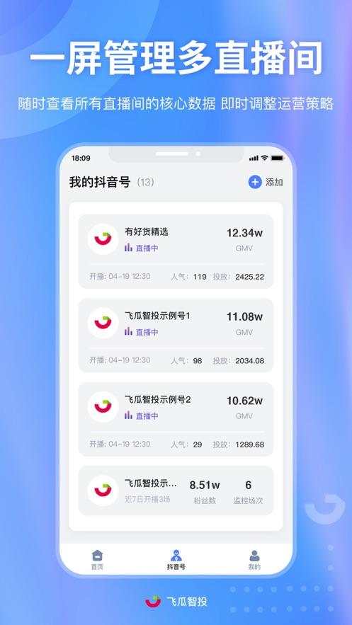 飞瓜智投包括实时监控抖音直播间流量来源、主播kpi考核、分钟监控投放消耗优化投产、一屏查看多直播间、直播回放等多达26+功能正陆续同步到APP当中!
