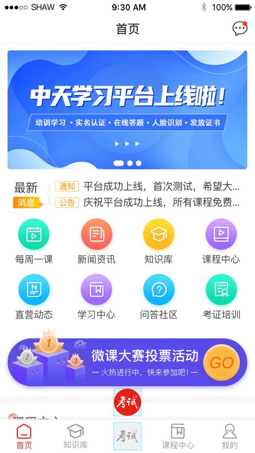 中天学堂app是一款在线培训学习平台,平台拥有首页,知识库,考试,课程中心,我的等等功能板块,可以帮助用户更好的移动学习提升能力。