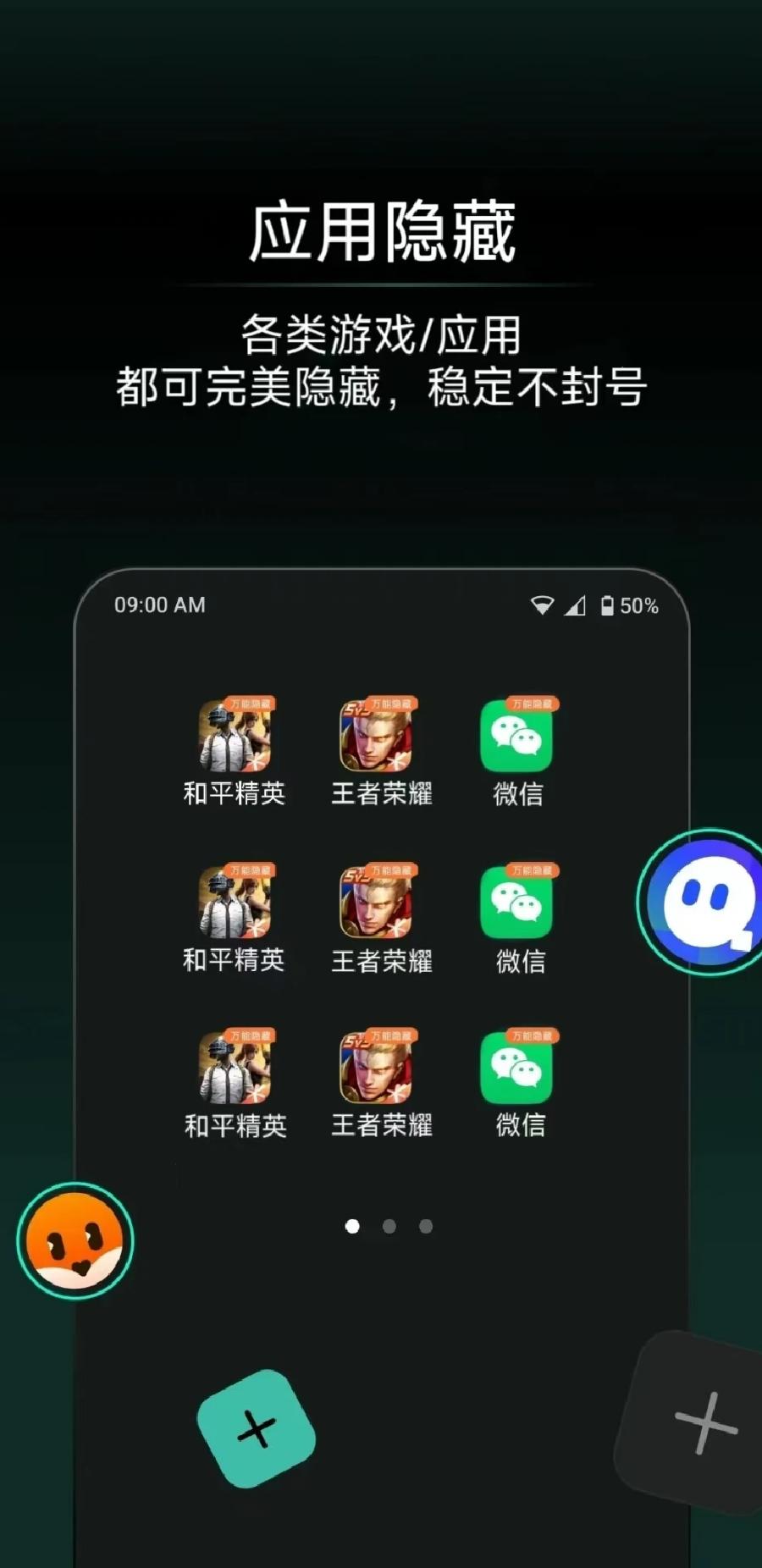 应用隐藏,支持应用游戏双开,大小号挂机;完美运行王者、和平吃鸡、微信等所有应用游戏.