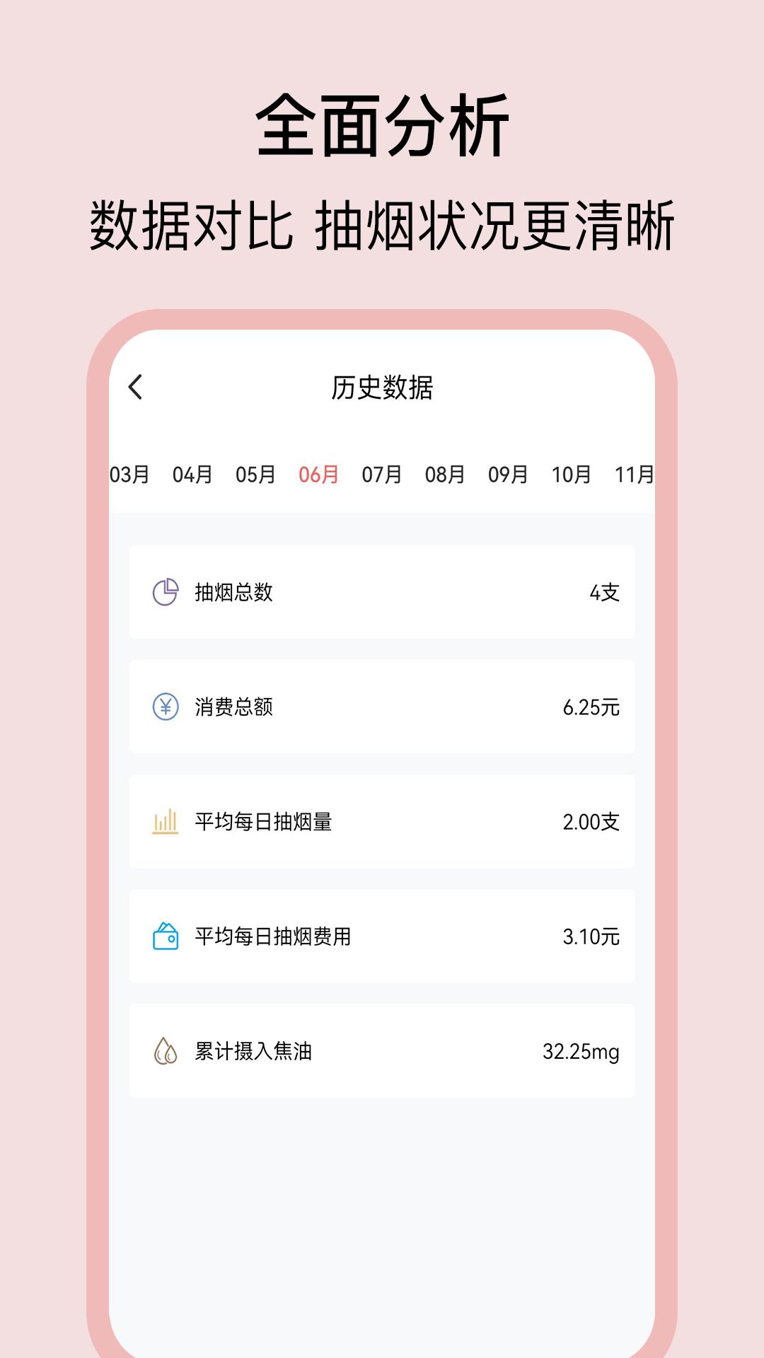 【抽烟报告】:根据您的抽烟情况生成专属戒烟抽烟报告,包括抽烟消费金额、焦油统计等,详细记录每天、每月、每年的抽烟信息。精确统计每支烟!