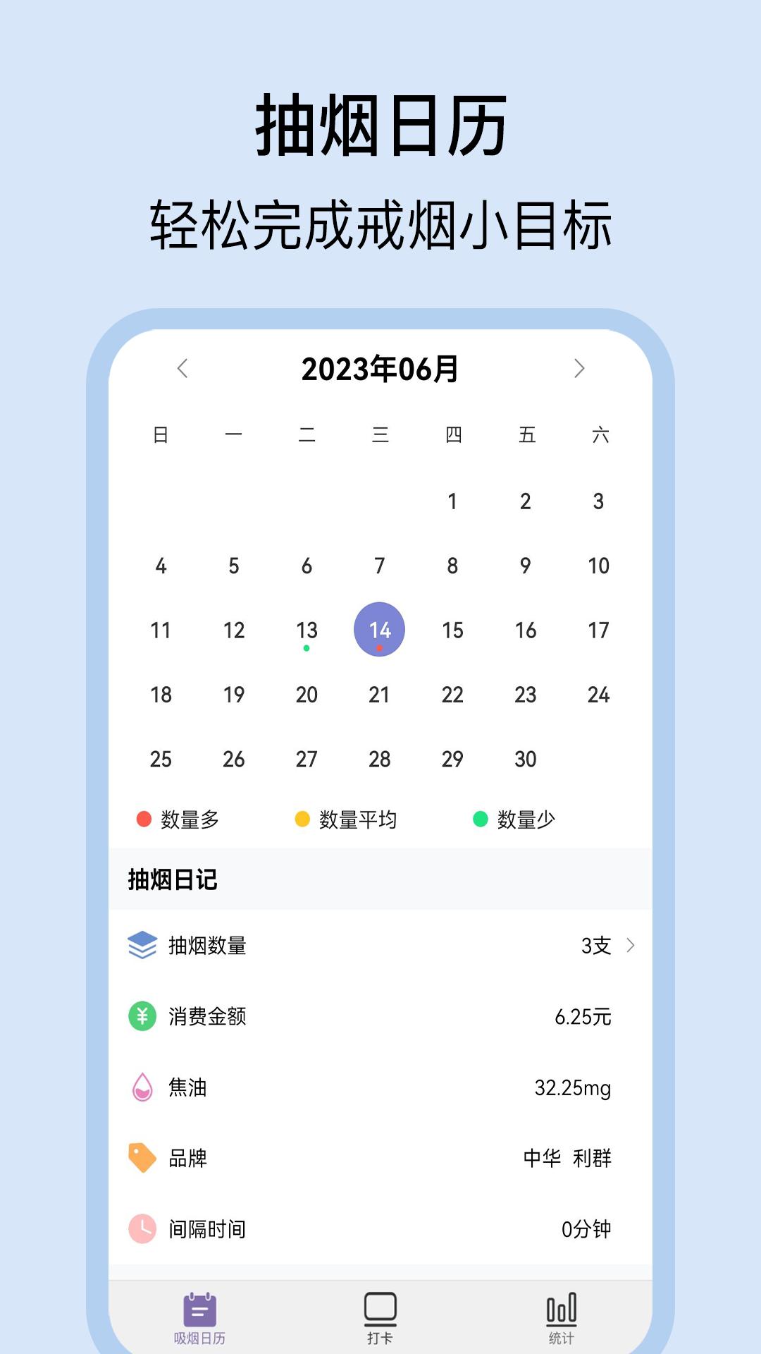 【抽烟日历】:在日历中可以轻松查看每天、每月的抽烟数据!每月、每日抽烟数量、香烟消费金额、吸入的焦油量一目了然!