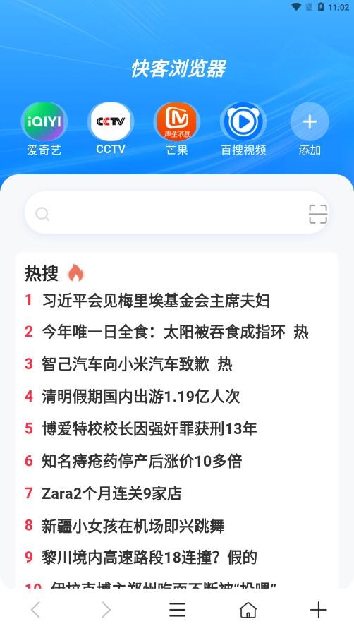 快客浏览器采用极简界面,包括体育财经、娱乐资讯、实时热点,浏览更省流量,运行流畅快速,让您高速安全上网。