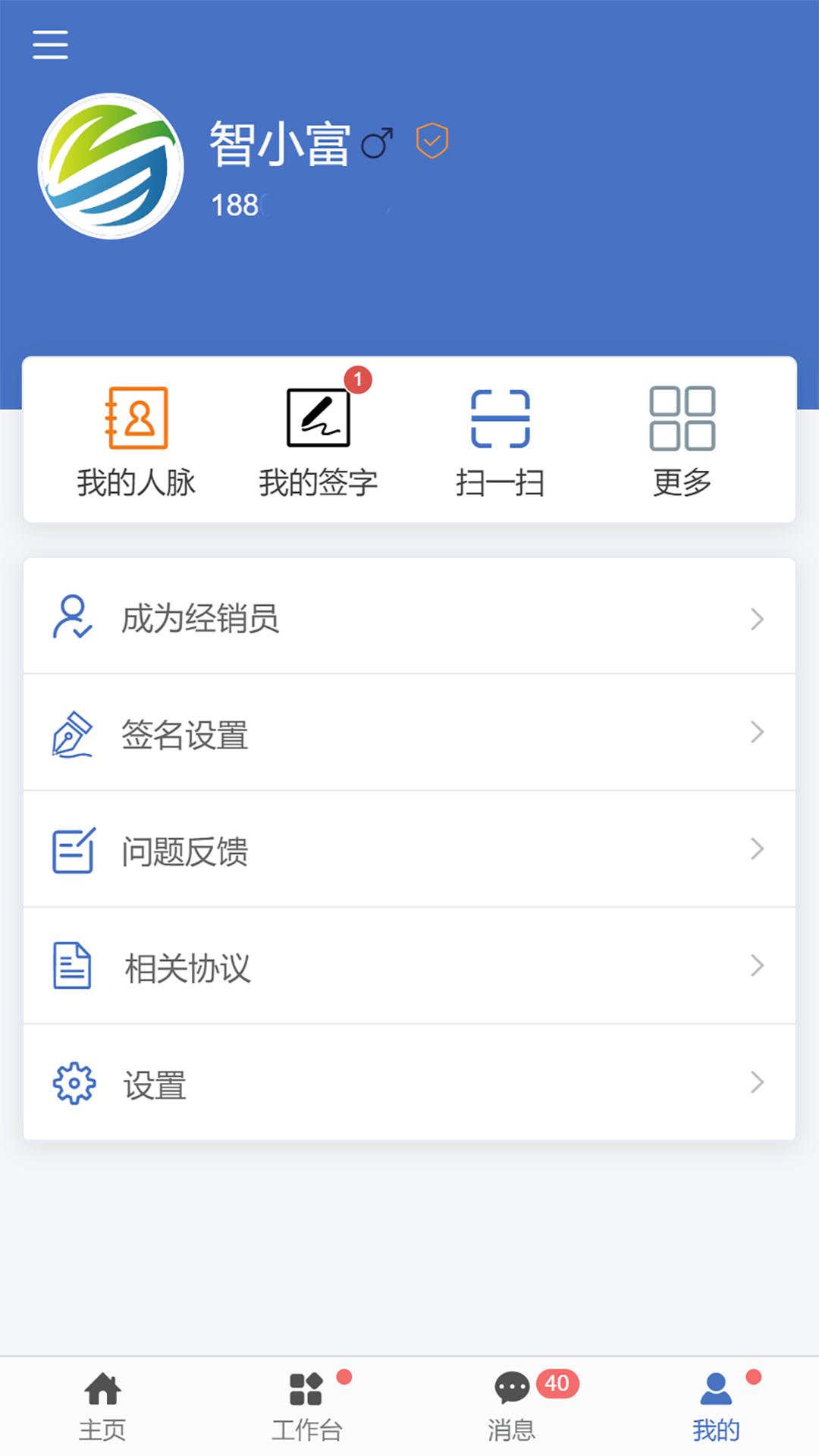 智富宝app下载是广州智富互联网科技有限公司官方倾情推出,软件拥有首页,工作台,消息,我的等等功能板块,可以帮助更好的企业经营管理。
