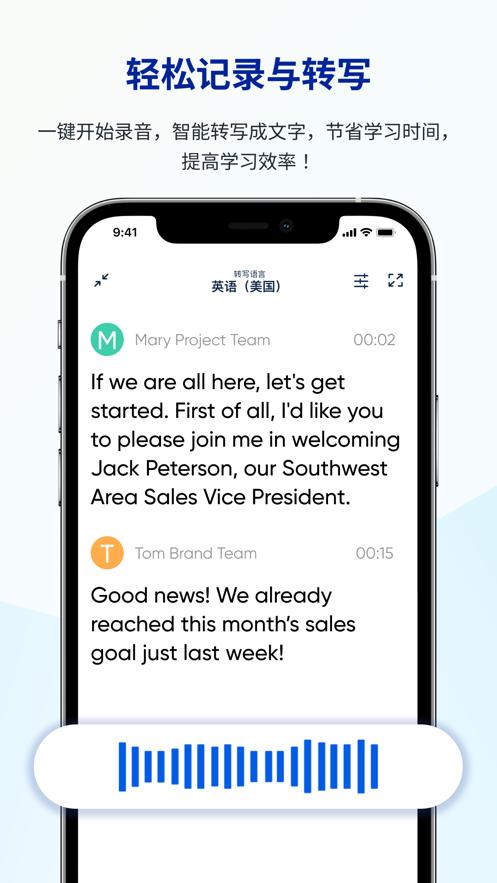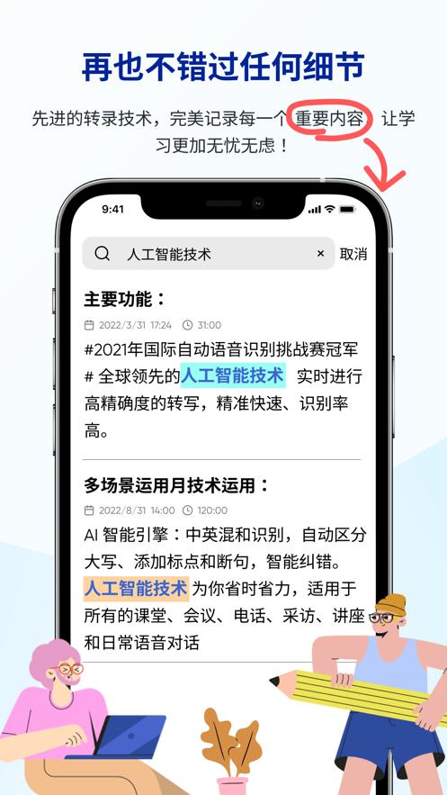 实时转写:为你实时记笔记、录语音,准确度高;结束后自动保存文字和语音记录。
