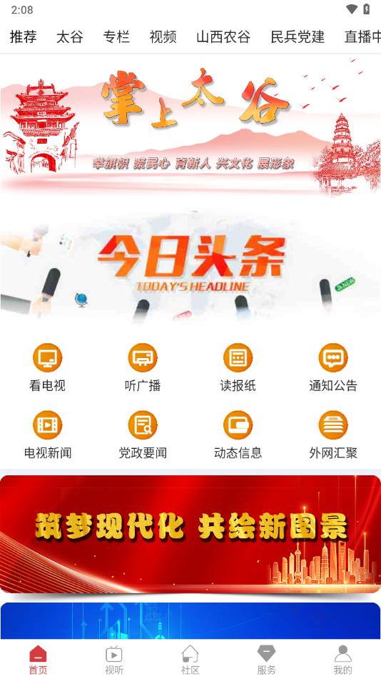 掌上太谷app是专为晋中市太谷区制作的融媒体移动服务平台,平台拥有新闻资讯,视听,社区,服务,我的等等功能板块,可以帮助更好的引导及服务太谷区。