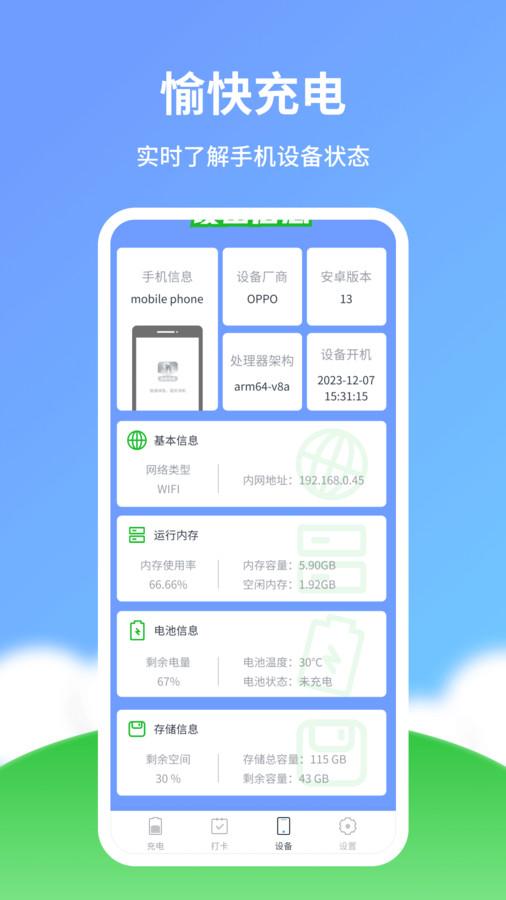 愉快充电APP是一款手机充电工具类软件,智能的电量预测功能,精准为大家预测手机的剩余电量,根据个人的充电情况,进行智能化的分析,延长电池的使用寿命!