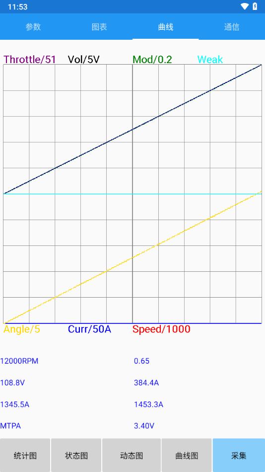 本手机软件能够方便快捷地监视电机转速,电池电压,电流,输出功率,工作状态,并对运行状态的所需要各种参数进行配置,并绘制工作曲线,实时了解电机工作特性,通过调试参数,使得电机工作在匹配优化状态。