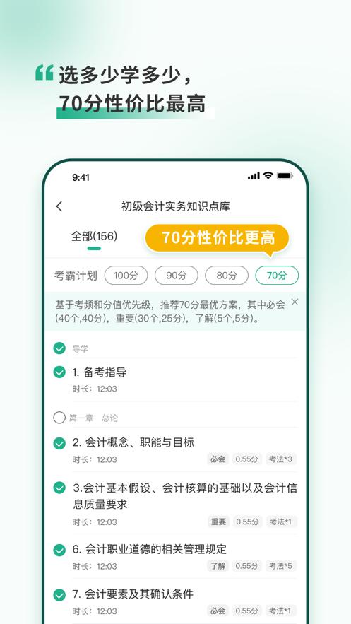 每个知识点标明考频、分值和考法,学生可快选70分、80分、90分等学习计划,研究发现,70%分值只有35%的知识点数;