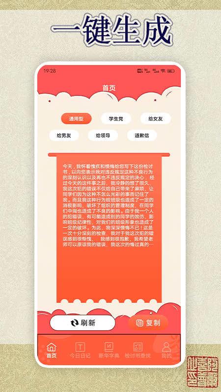 1、帮助大家轻松的生成自己需要的检讨书,还能写日记。