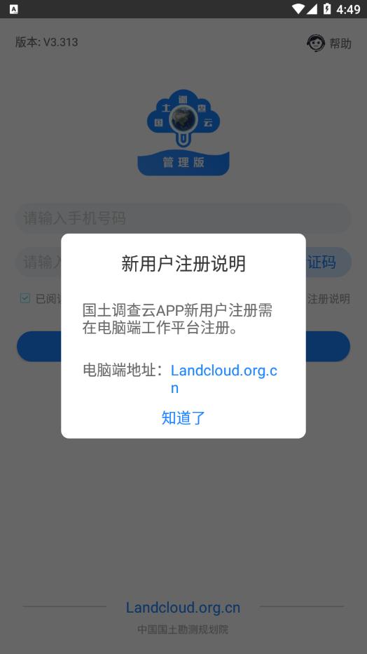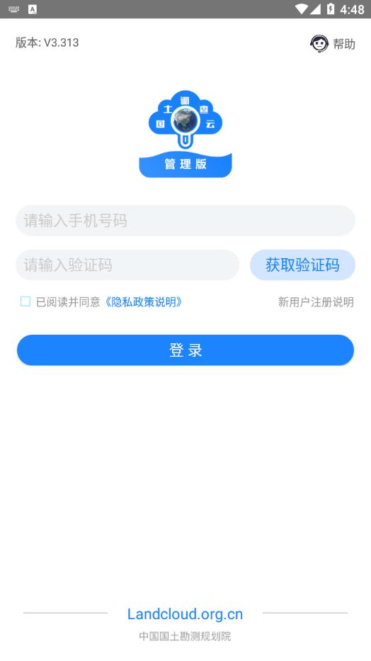 1、用户登录国土调查云工作平台网页端(landcloud.org.cn),在用户登录界面进行【新用户注册】,根据提示填写信息,提交成功后,由单位管理员审核账号;