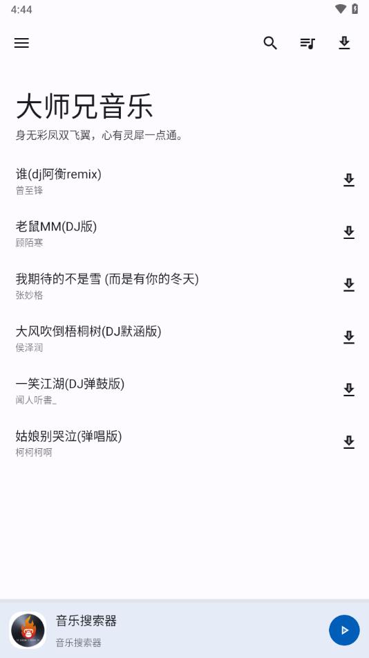 大师兄音乐是一款专为喜爱音乐的你量身打造的听歌神器,页面非常简洁,完全没有多余的东西,无论你想听什么歌,这里都能搜到,并且还支持高质量的无损音源文件下载。