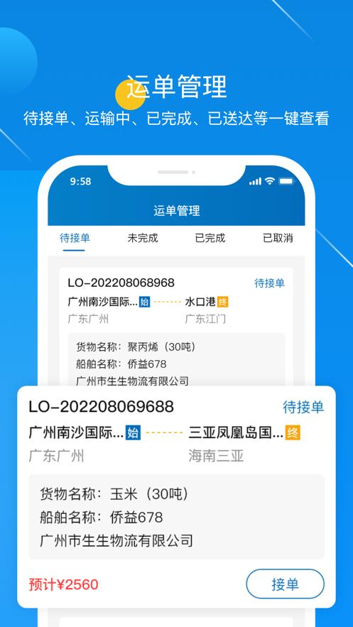 待接单、运输中、已完成、已送达等一键查看
