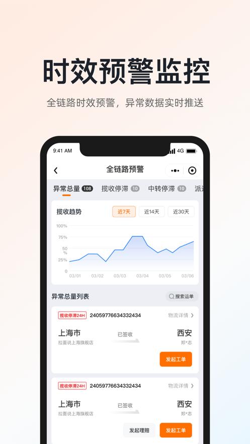用户可查看包括运单跟踪、揽派监控、全链路预警情况,及时查询定位异常件,并一键发起工单。支持自定义维度时间查询。