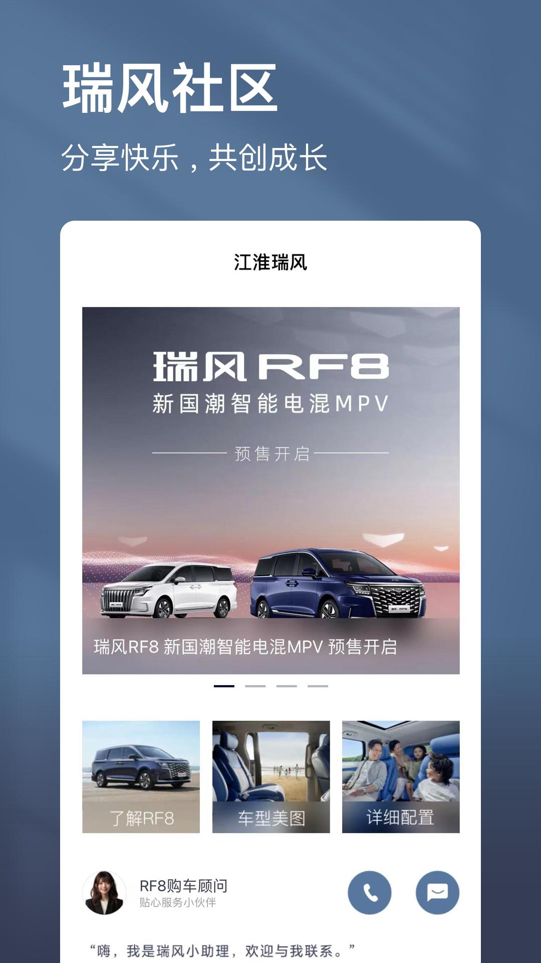 江淮瑞风App提供远程车控、一键维保、事故救援、一键家桩等便捷服务,让您智能用车。