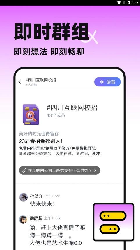 1、在详情界面,搜索或者自己创建一个喜欢的群组,和志同道合的人一起畅聊,用自己舒适的生活态度连接另一群相似的灵魂。