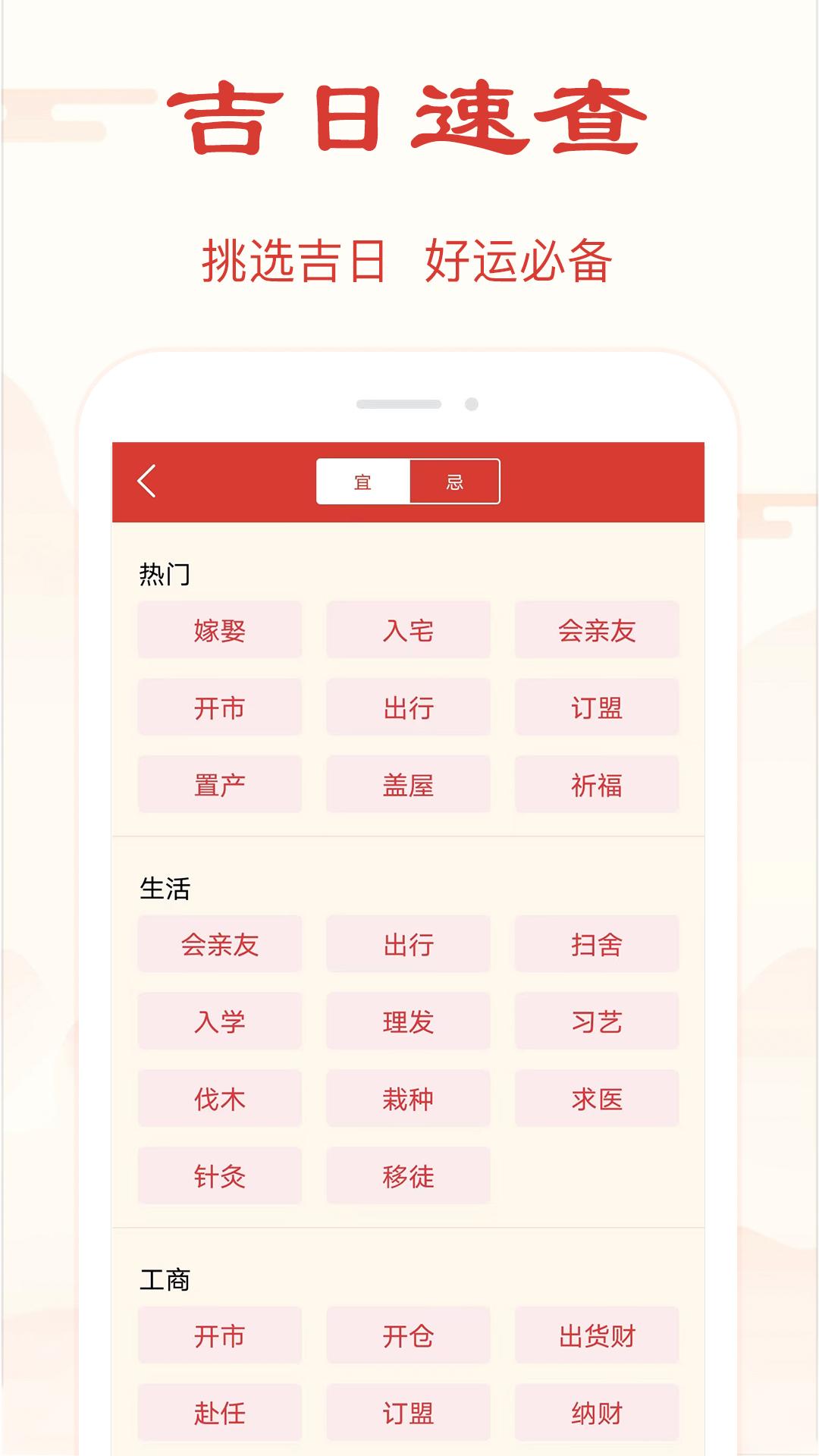 ①日历:黄历宜忌、节日节气、吉日查询、历史查询;