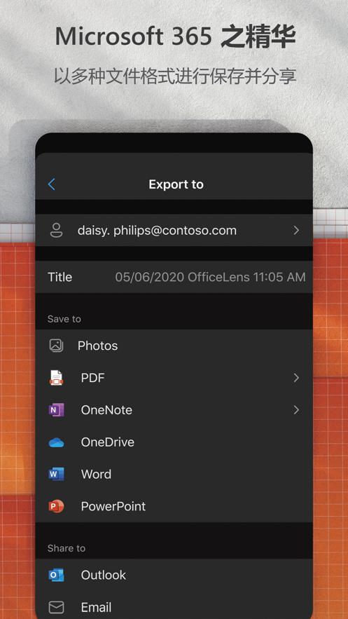 • 可选择以 PDF、图像、Word 或 PowerPoint 格式保存到 OneNote、OneDrive 或本地设备等位置
