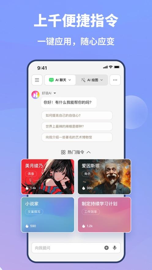 丰富的指令库,可以轻松满足各种各样的需求,体验有趣的对话,快速提高工作效率