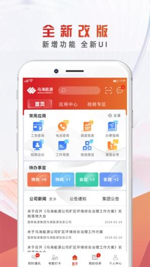 乌海能源企业应用app下载是乌海能源官方推出的一款移动办公服务平台,平台拥有即时通讯,考勤打卡,首页,我的任务,个人中心等功能板块,可以帮助更智慧高效协同工作。
