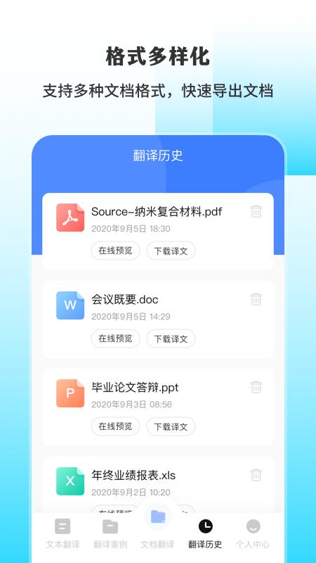 【翻译历史】识别结果、文档翻译结果等一键保存云端历史记录,可随时查看,译文一键复制、分享给好友