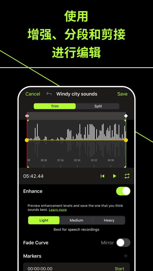 使用修剪或拆分选项(包括可调节淡出曲线和标记)编辑录制文件