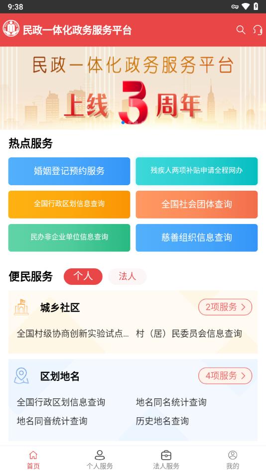 民政通APP是民政部官方倾情推出,软件拥有首页,个人服务,法人服务,我的等等功能板块,可以帮助用户更好的民政政务办事,需要的朋友欢迎前来下载使用。
