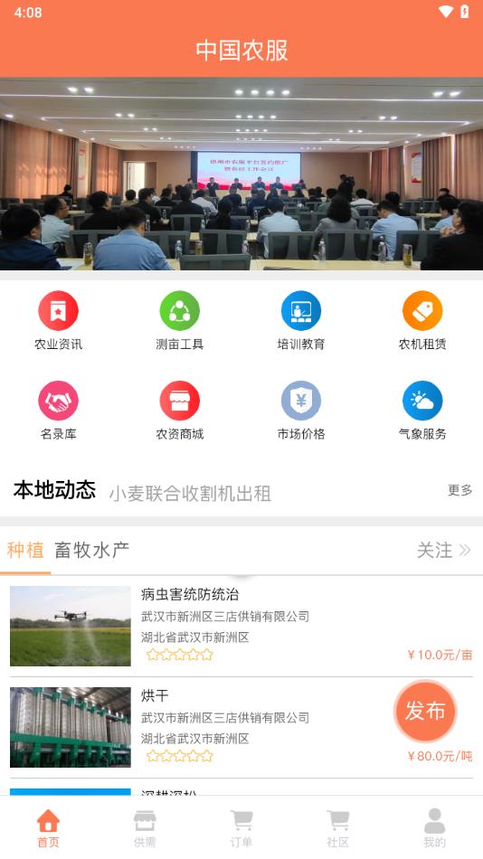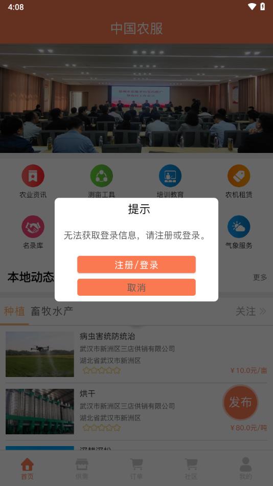 中国农服app下载是一款农业服务移动平台,平台拥有首页,供需,订单,社区,我的等等功能板块,可以帮助更好的服务农业,需要的朋友欢迎前来下载使用。