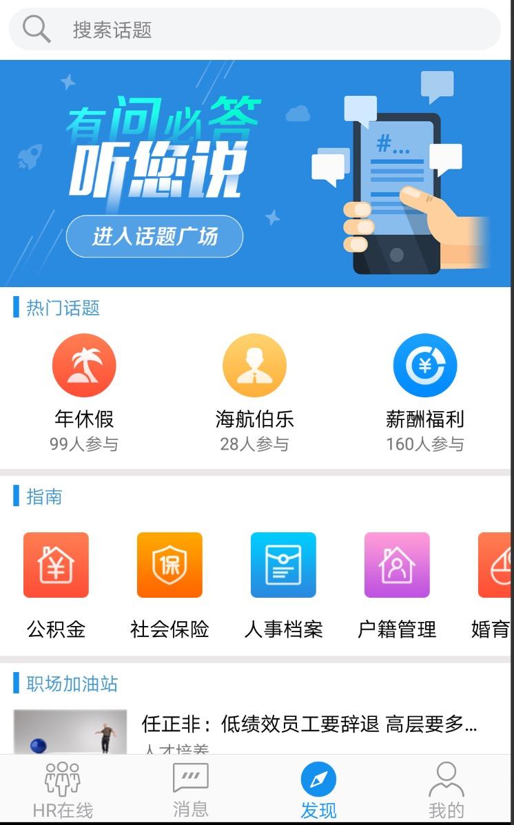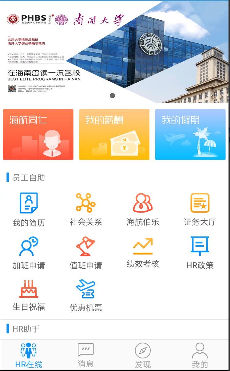 HR在线海航下载app是一款人力资源服务平台,平台拥有HR在线,消息,发现,我的等等功能板块,可以帮助员工更好的沟通协同。