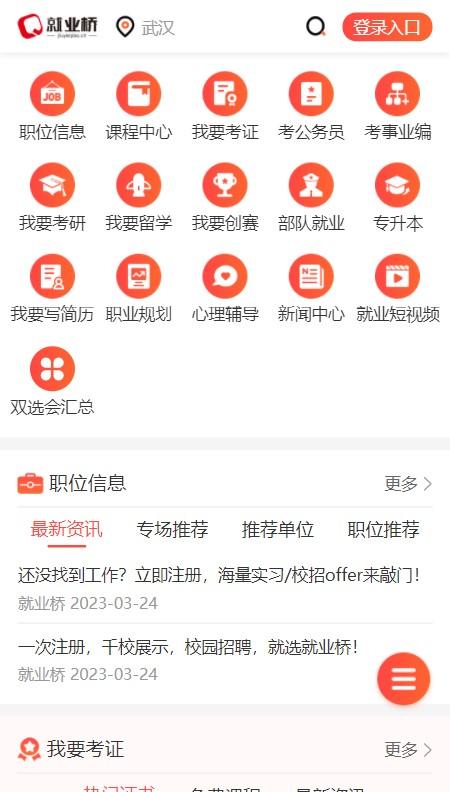 全方位的就业服务应用,涵盖了“我要找工作”、“我要考研”、“我要专升本”、“我要考证”、“我要考公务员”、“我要考事业编”、“我要创赛”、“我要写简历”、“我要生涯规划”等服务模块,为广大学子提供了一站式的求职服务。