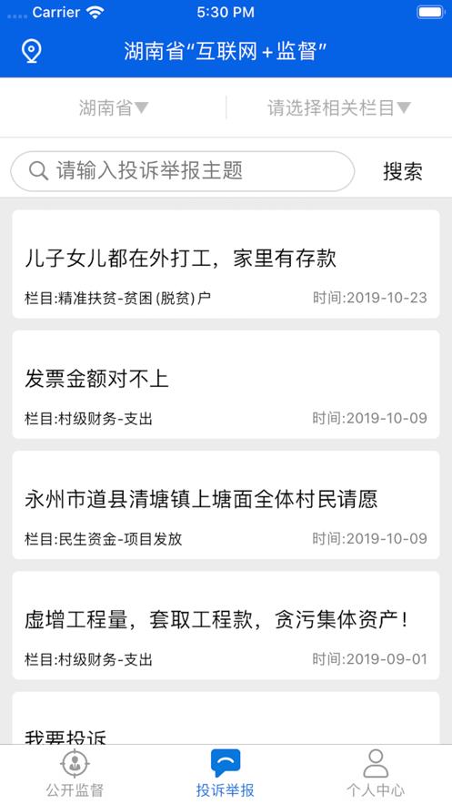 三湘e监督设置民生项目、精准扶贫、村级财务、投诉举报等模块,