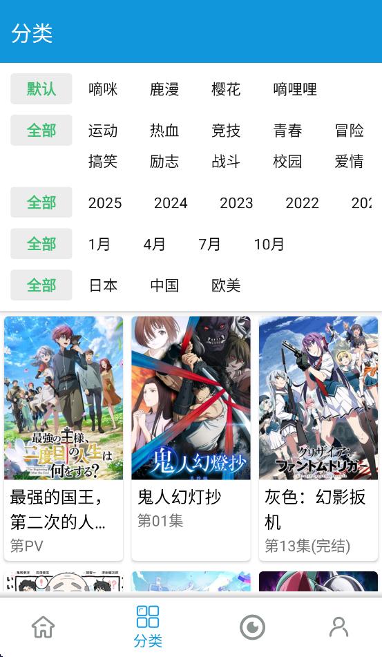 可以根据各种分类找到喜欢的动漫资源,支持直接搜索、缓存下载和电视投屏。