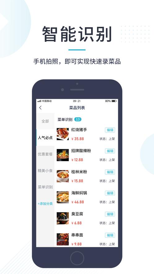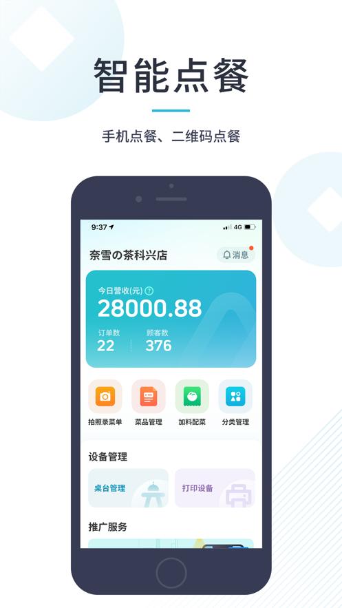智掌柜商户版帮助商户快速建立扫码点单服务,可新增编辑菜品、上下架菜品、绑定餐桌码、绑定打印机、实时查看营收情况及订单情况。