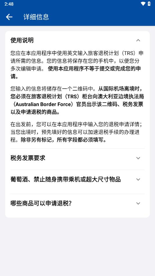 Australia TRS app又名为tourist refund scheme,是澳大利亚游客退税计划手机客户端,软件可以帮助用户一键智慧退税,需要的朋友欢迎前来下载使用。
