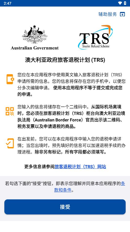 澳大利亚内政事务部游客退税计划 (TRS) 手机应用程序。
