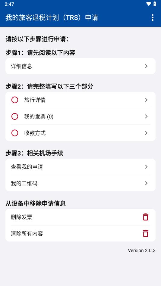 在出发前,您可以在本应用程序中输入您的退税申请详情;