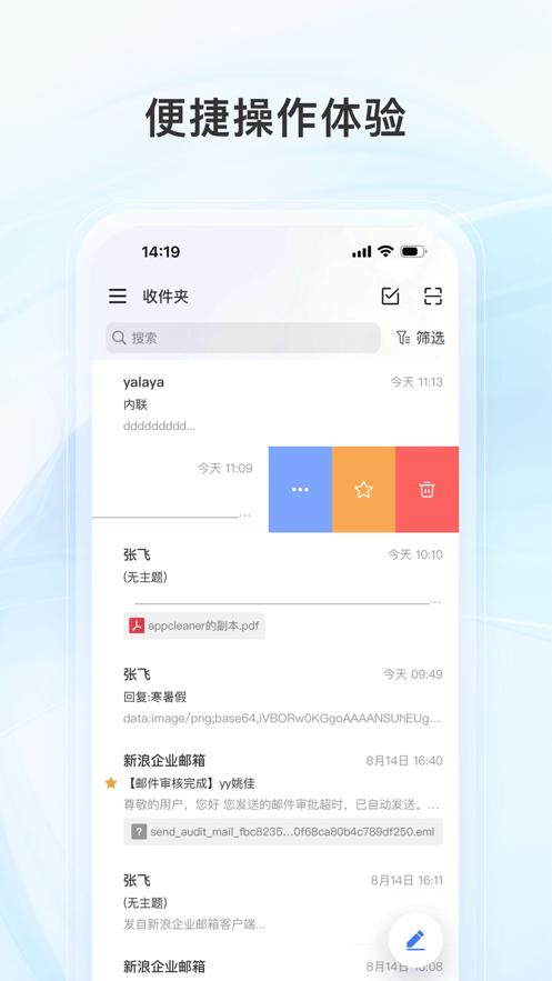 新浪企邮app下载是一款手机邮箱软件,软件拥有邮件收发,打卡,日志,名片,附件收藏等等功能服务,可以帮助用户更高效智慧工作。