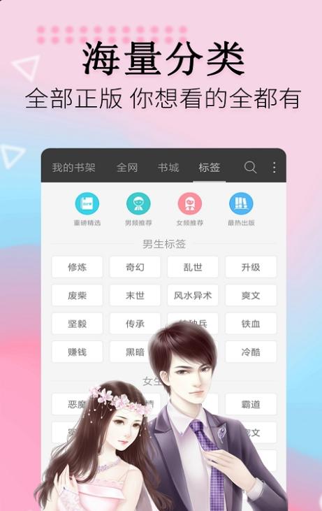 3、十个大分类,上千个标签,权威小说榜单,在线缓存离线阅读,精品全本一键下载