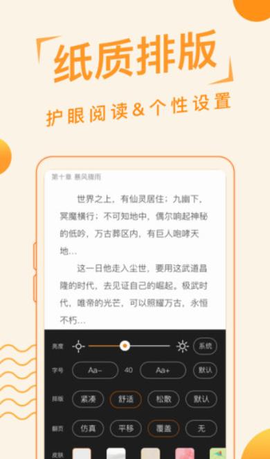 3、护眼模式、仿真翻页,让你追书更加舒适,还可以自由调节页面排版、字体、主题、背景等