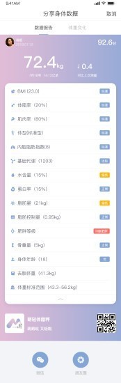 2、专业地数据报表分析,可以监测你的BMI、脂肪重量、身体年龄、水分等等,更科学地了解自己的身体