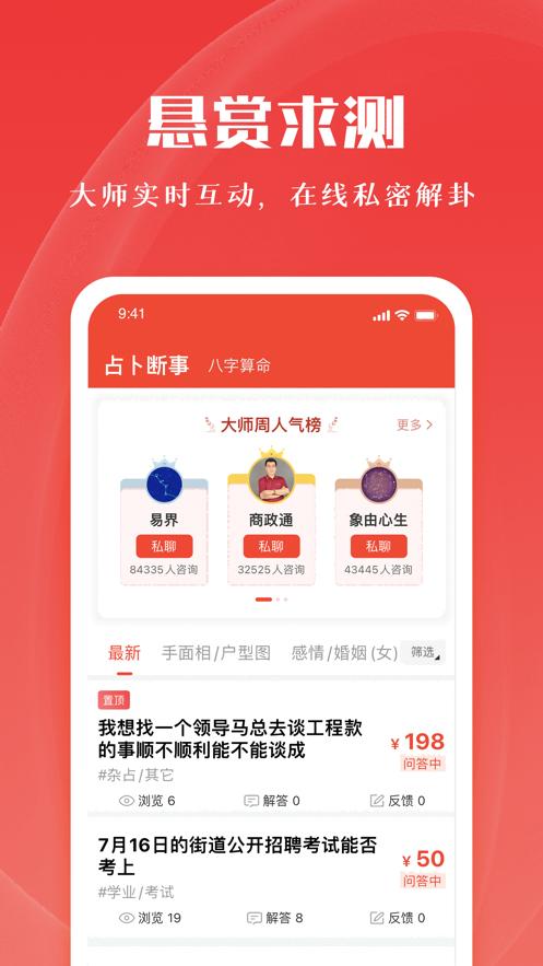 占卜算命大师是一款专门为用户们推出的线上算命的软件,要是你感兴趣的话就一定要来这里下载,这里的算命功能是非常的全面的,能为用户们提供各种各样的功能,满足用户们的不同的算命需求,使用起来的话也是非常的方便的,感兴趣的话就一定要来这里下载试试,下面小编就为用户们分享一下下载地址哦,一起来这里看看吧!