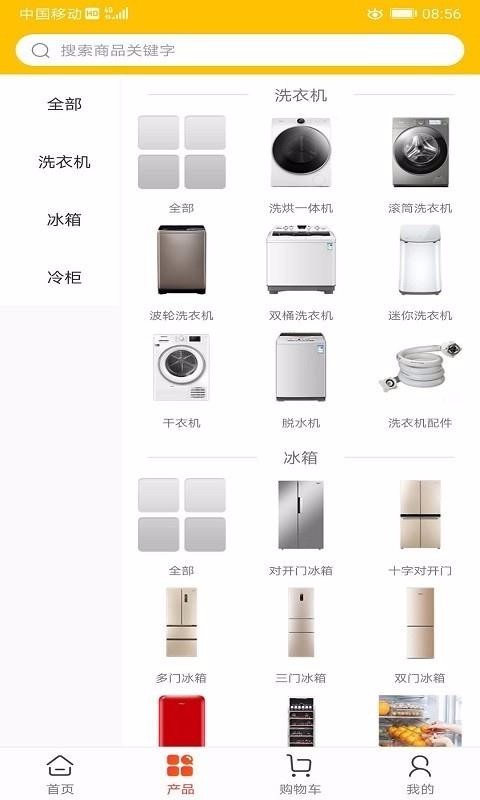 超详细的产品分类,代理的产品都能线上采购,如洗衣机、冰箱、冷柜,能够分类查找;
