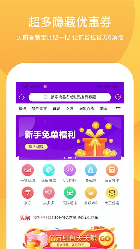大王券app是一个智能的导购平台,app目前与许多热门的电商平台进行合作,例如:天猫、淘宝、京东、拼多多等,让用户可以在这里轻松的找到各个购物平台的优惠券,每天登录app就可以领取优惠券购物了,让您的购物可以变得更轻松、更省钱;在平台内可以直接进行跨平台购物,让您可以更快速的使用自己领取的优惠券,这样就可以满足许多用户在线购物的需求。
