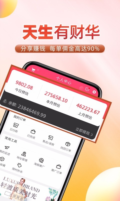淘宝网、京东商城等知名电子商务平台性价比高商品汇聚一堂,给你好看;每日都会举行促销活动,自动更新主题活动商品,让你更多挑选;一键共享链接推广商品,推广取得成功即享90%极高提成奖励;大量宣传海报推广素材图片任你使用,不用创造素材图片直接推广商品。