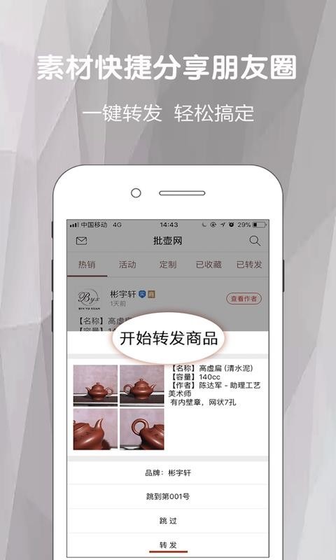 批壶网app是一款技术专业的紫砂茶壶批发app,要是为紫砂茶壶的分销者提供一手货源,作为代销商不仅可以自己购买这里的紫砂茶壶商品,并且可以自由的推广紫砂茶壶,以分销的方法给自己赚取收益,而且,这款紫砂茶壶批发app手机版贴心的为每个分销者设计了微信朋友圈的素材和创意文案,用户可以利用宣传海报、创意文案开展商品的推广营销,当有人向自己购买紫砂茶壶的话用户可以立即在这里提货。