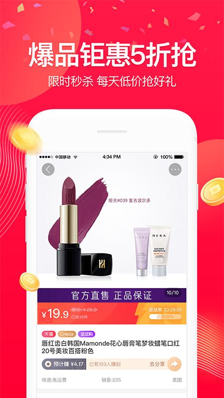 汇聚很多购物返现福利以及红包,从此让你开展低价购物,购物还能得到更多奖赏;能够零元创业赚钱,共享商品就可以赚钱了,另外还能变成代理商,在家赚钱;给你提供了知名品牌限时抢福利,很多进口品牌商品任你选择,全是正品,服务平台有保障。