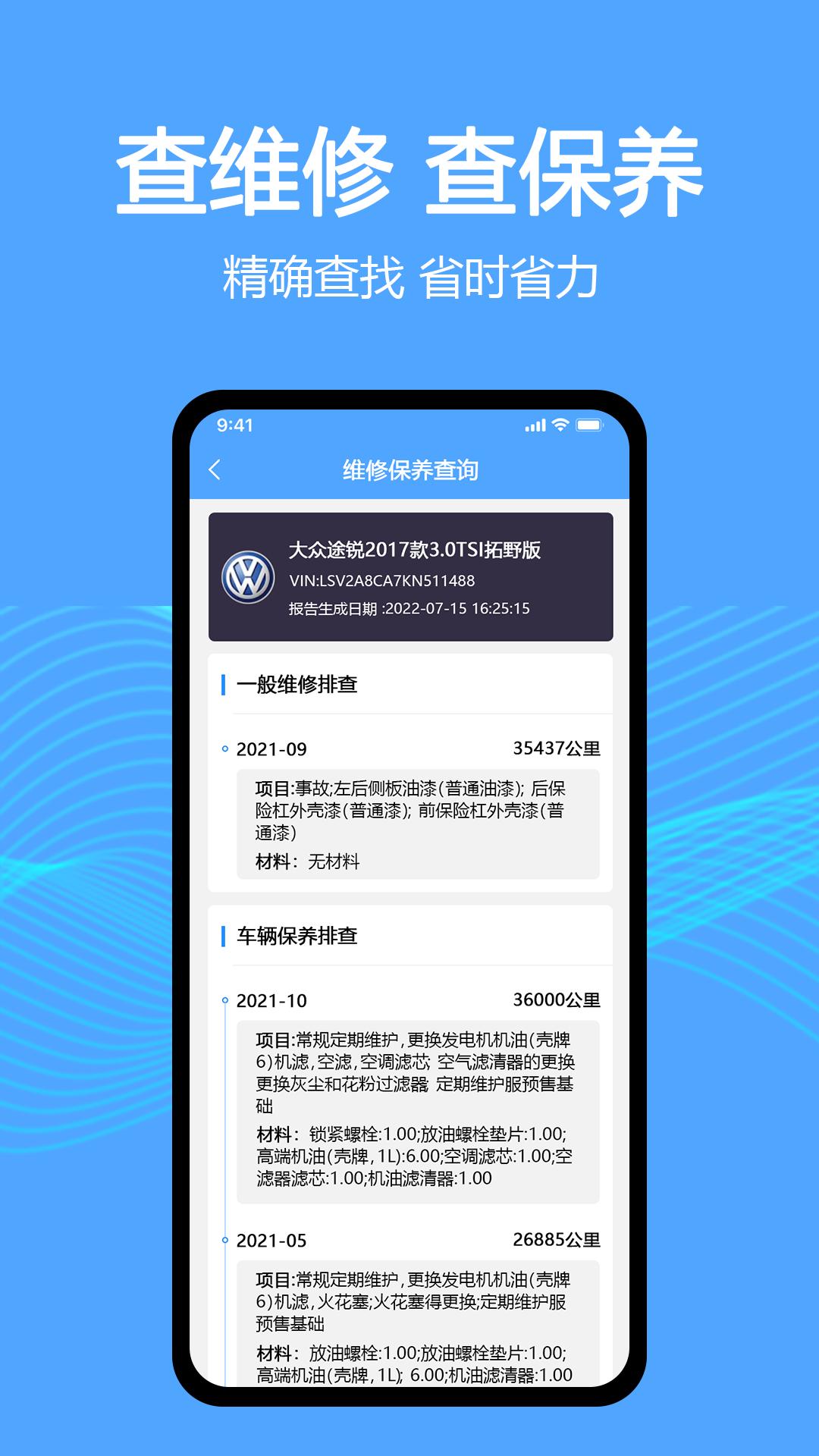 1.输入自己的架号(VIN码)一键轻松查询自己的车辆维修记录、保养记录等等